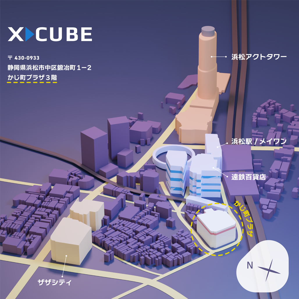 浜松駅から徒歩3分デジタルのテーマパーク『XCUBE』 団体・イベント利用案内 XCUBEは浜松街中のVR体験ができるテーマパークです。学校の遠足・修学旅行での最新デジタル技術を体験学習の場として、企業の社員旅行や懇親会といった福利厚生としてぜひご活用ください。大型プロジェクタを用いて、駅前のイベント会場としてもご利用頂けます。 XCUBEとは 問い合わせ 最先端のデジタル体験 VR・ARといった最先端のデジタル技術を、全11種類のアトラクションで体験できます。 大人数での貸切もOK 全館貸切も可能です。混雑を気にすることなく、楽しんでいただくことが可能です。 イベント開催も可能です 館内のイベントスペースを用いて、イベント開催も可能です。200インチ規模の大型プロジェクタもご利用いただけます。 団体でXCUBEを楽しむ 修学旅行で。 社員旅行で。 サークルの懇親会で。 団体でXCUBEをご利用いただくと、通常より割安な価格でお楽しみいただけます。実際に修学旅行・遠足・子ども会・スポーツ少年団の懇親会に加え、社員旅行などでもご利用実績があります。 団体利用の詳細はこちら XCUBEでは、入場時検温や館内滞在時のマスク着用・アトラクションの消毒など新型コロナウィルス感染症対策に力を入れています。 See More 交通アクセス好立地のイベントスペースとして。 Wi-Fiや大型プロジェクタも完備。街中屈指のイベントスペース eスポーツ大会・ダンス発表会・etc... 小〜中規模のイベントに対応 XCUBEイベントスペース eスポーツでの利用大型プロジェクタを用いることで迫力のある演出が可能です。有線・無線LANも完備で、オンラインが必要なゲームも安心。 プレゼン・勉強会の場としてお持ち込み頂いたPCを接続し、巨大なスクリーンを用いてプレゼン会場や、企業の勉強会にもご利用頂けます。 体験会の会場としてXCUBEは浜松駅から徒歩3分で、公共交通機関のアクセスも良好です。体験会イベントの会場としてもオススメです。 イベントスペースのご案内 施設情報 住所 静岡県浜松市中区鍛冶町1-2かじ町プラザ 3F アクセス 浜松駅から徒歩3分新浜松駅から徒歩2分 営業時間 10:00〜20:00(最終受付時間 19:30) 連絡先 TEL: 053-488-7666Mail: info@xcube.jp